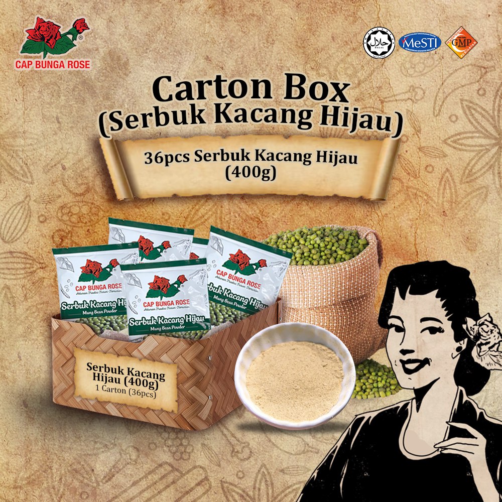 [Carton] Serbuk Kacang Hijau Cap Bunga Rose 400gm